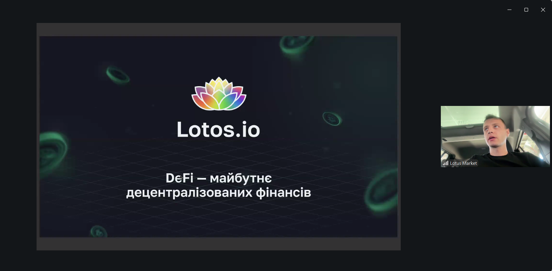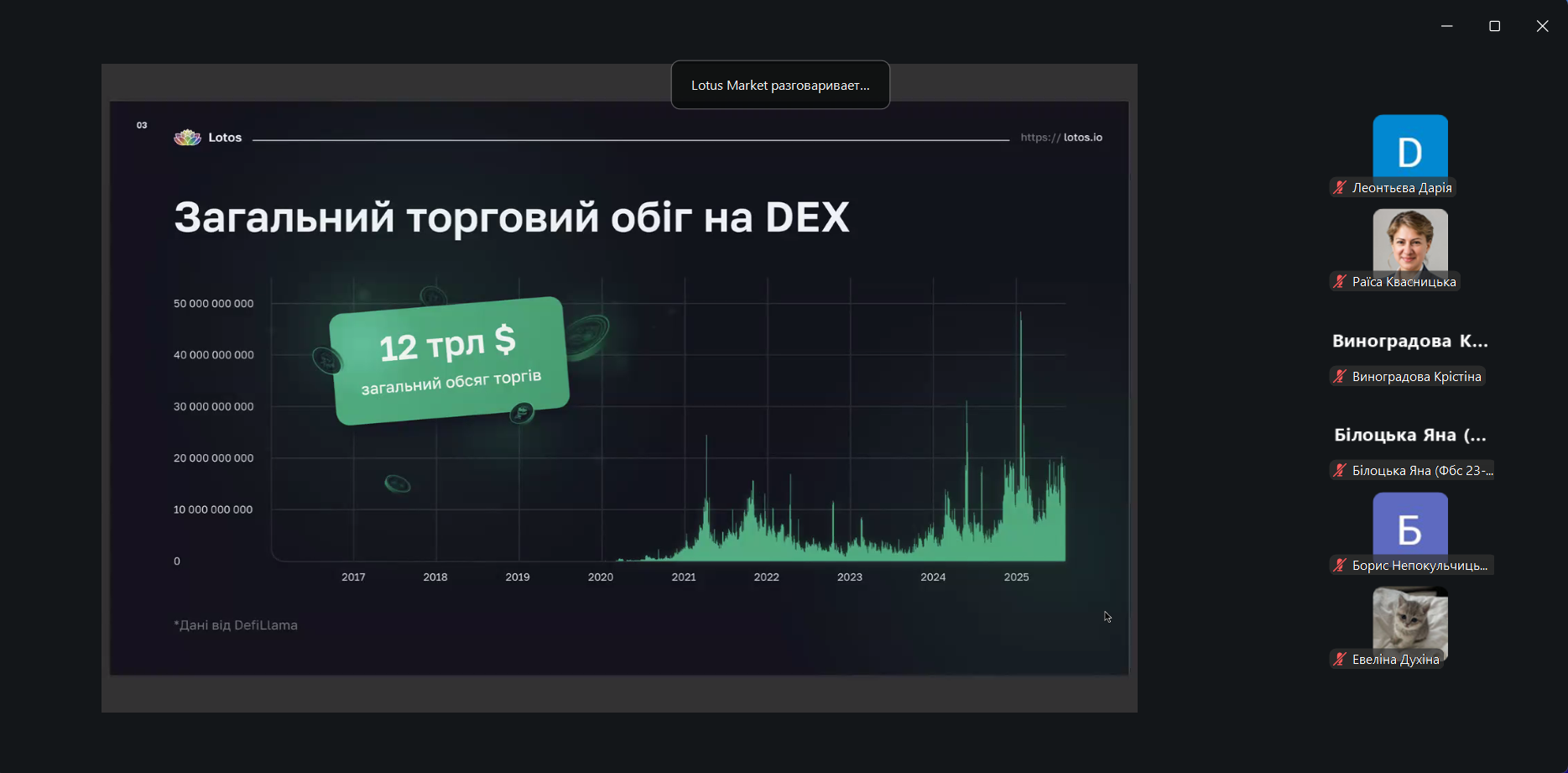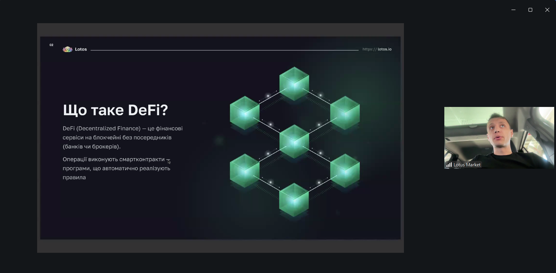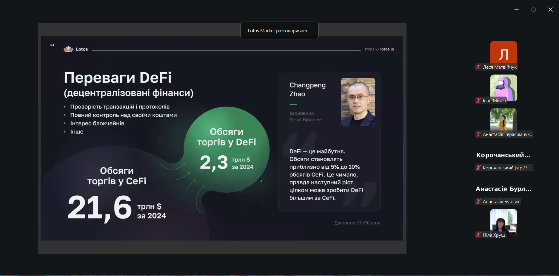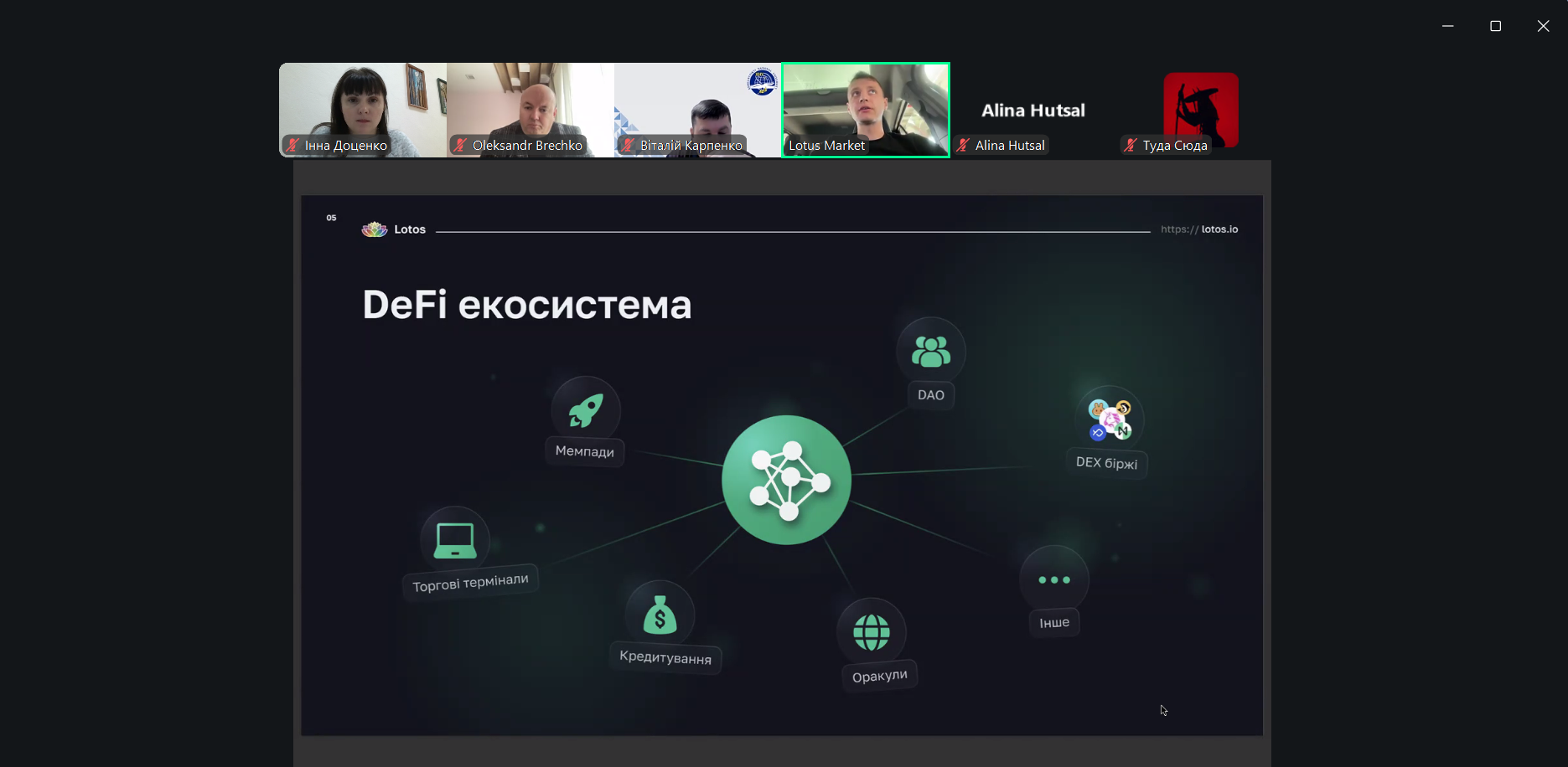 Лектор навів актуальні дані щодо загальної капіталізації ринку DeFi, обсягів ліквідності і домінування провідних блокчейнів, а також наголосив на його ключових ризиках, що стримують розвиток індустрії, зокрема, технічні вразливості смарт-контрактів (злам протоколів і втрата ліквідності); регуляторні обмеження та невизначеність; ризики централізації окремих інфраструктурних елементів. Спікер підкреслив важливість розвитку систем, орієнтованих на користувача, та подальше розширення можливостей DeFi у сфері інвестицій і трейдингу. В цьому контексті було представлено ключові розробки та можливості торгової платформи Lotos.io, в рамках якої вирішуються важливі завдання розвитку DeFi індустрії.