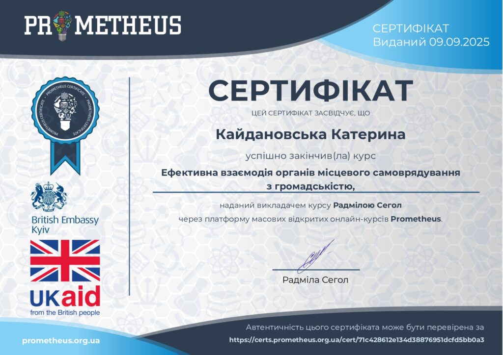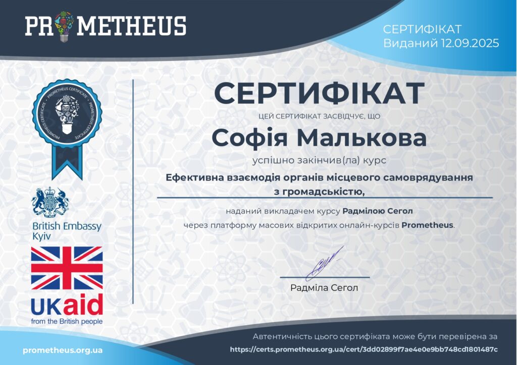 В рамках вивчення освітнього компонента «МІСЦЕВІ ФІНАНСИ» здобувачі першого (бакалаврського) рівня вищої освіти 072 «Фінанси, банківська справа та страхування» груп ФБС-22-1, ФБС-22-2 реалізували практику неформальної освіти, використовуючи можливості платформи PROMETHEUS, зокрема пройшли відкритий онлайн-курс “ ЕФЕКТИВНА ВЗАЄМОДІЯ ОРГАНІВ МІСЦЕВОГО САМОВРЯДУВАННЯ З ГРОМАДСЬКІСТЮ”. Курс розроблено, створено та впроваджено при підтримці Посольства Великої Британії в Україні.
