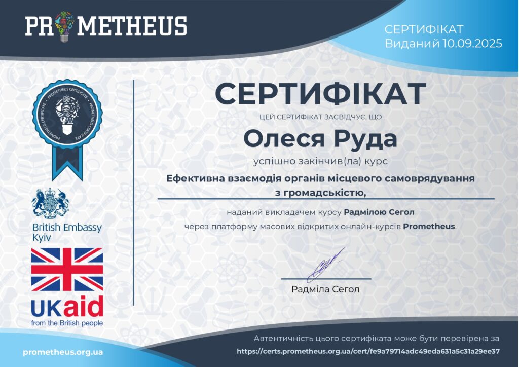 За результатами проходження курсу здобувачі бакалаврського рівня вищої освіти ознайомилися із основними засадами, методами, сучасними принципами, стандартами, механізмами та інструментами взаємодії з громадськістю, а набуті ними компетентності допоможуть стати поінформованими та брати активну участь у розвитку місцевого самоврядування. Результати неформальної освіти (підтвердженням якої є сертифікат) частково зараховано як елемент навчальної роботи з ОК «Місцеві фінанси» викладач Ірина ФОРКУН, к.т.н., доцент кафедри фінансів, банківської справи, страхування та фондового ринку.