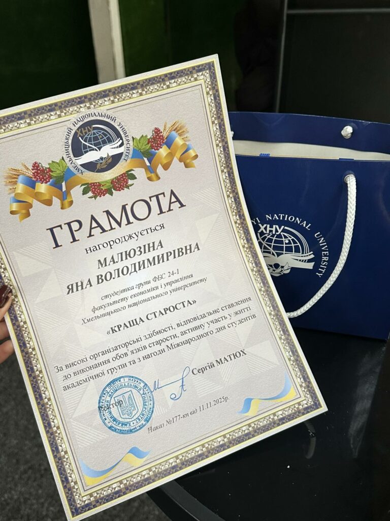 За високі організаційні здібності, відповідальне становлення до виконання обов’язків старости, активну участь у житті академічної групи та з нагоди Міжнародного дня студента була нагороджена грамотою за номінацією «Кращий староста факультету економіки і управління» студентка спеціальності «Фінанси, банківська справа, страхування та фондовий ринок» Малюзіна Яна – староста групи ФБС-24-1.
