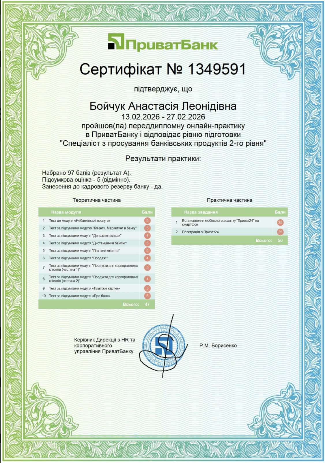 Продовжується співпраця студентів-фінансистів з АТ КБ «ПриватБанк» та АТ «УкрСиббанк» в рамках якої  здобувачі першого (бакалаврського) рівня вищої освіти ОПП «Фінанси, банківська справа та страхування» груп ФБС-22-1, ФБС-22-2 та ФБСз-22-1  Поважнюк Віола, Чикарьова Дар’я, Бойчук Анастасія, Петришин Максим, Стецюк Аліна під час проходження переддипломної практики успішно пройшли онлайн-практику від зазначених банків.