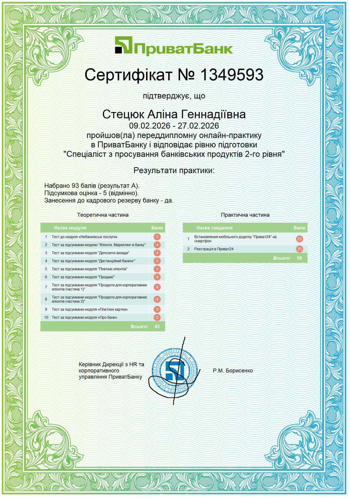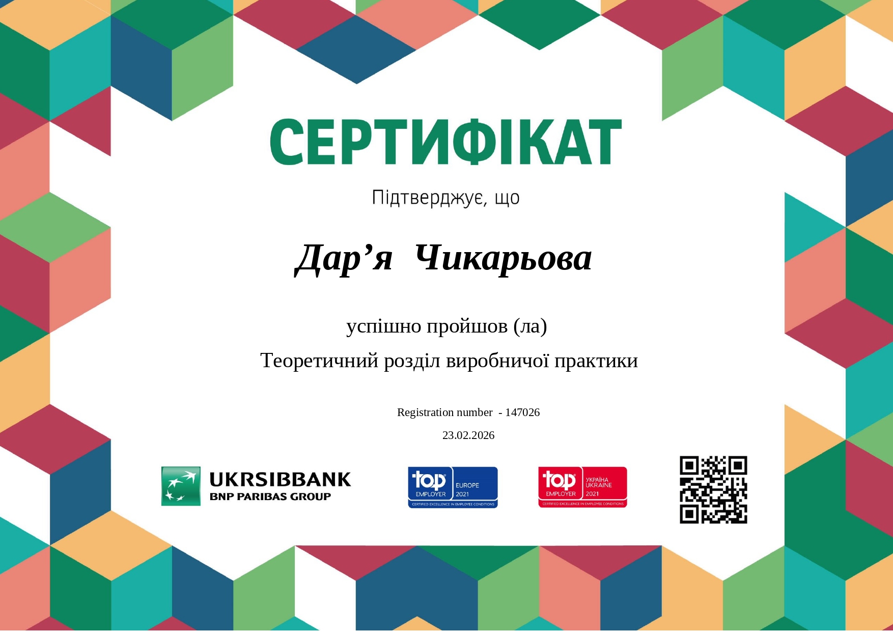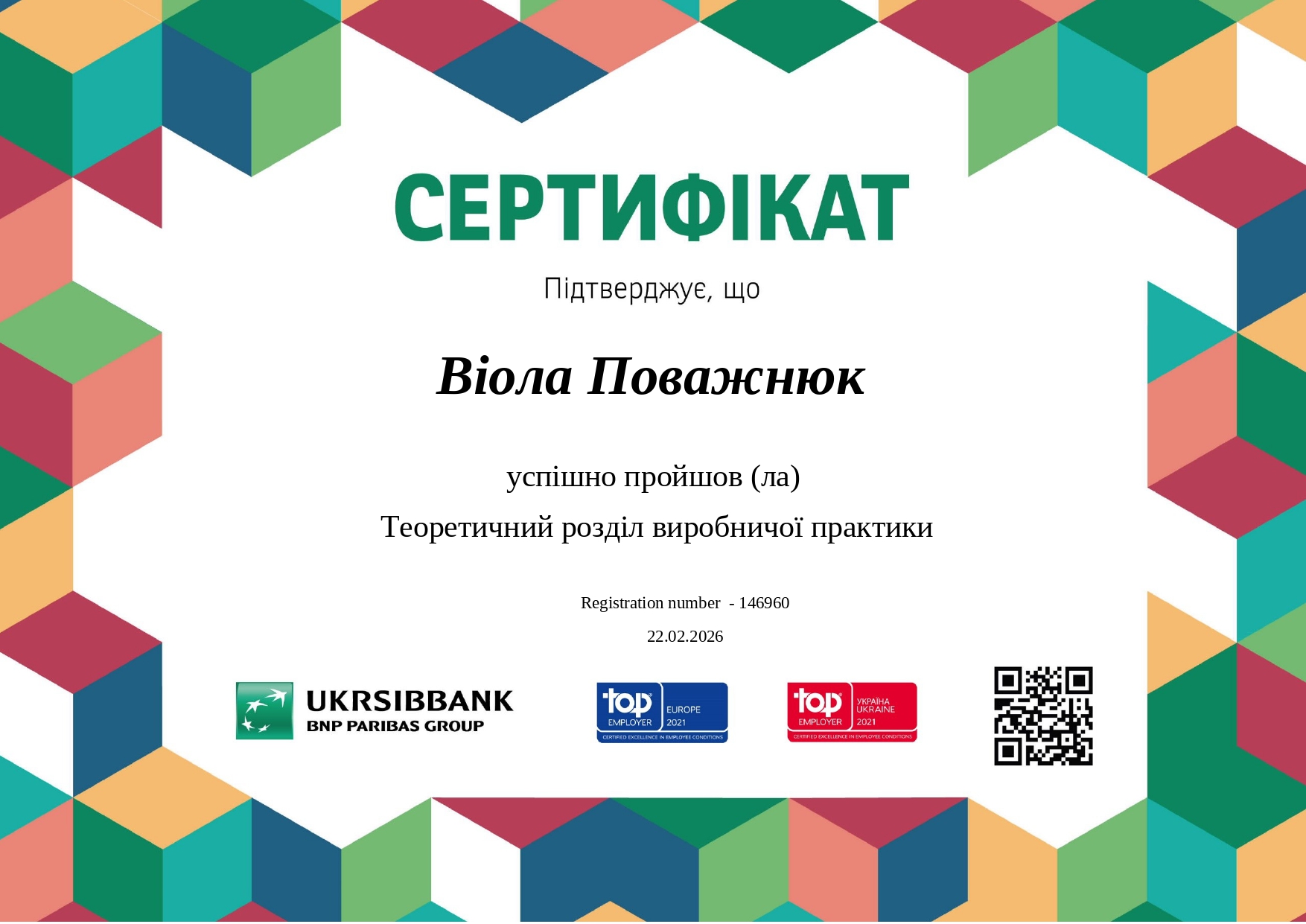 Проходження онлайн-практики від АТ КБ «ПриватБанк» та АТ «УкрСиббанк» для студентів сприяє підвищенню фінансової освіти на основі використання сучасних інформаційних технологій, формує навички дослідницького, пошукового характеру, розвиває практичні компетентності на основі отриманих знань, а також підвищує конкурентоспроможність випускників на ринку праці. Під час проходження онлайн-практики студенти повністю виконали Програму практики, виконавши всі тестові та практичні завдання від банку. Результатом успішно пройдених Програм практики банків стали сертифікати, що є офіційним підтвердженням набутих знань, умінь і практичних навичок у сфері банківської справи та фінансів.