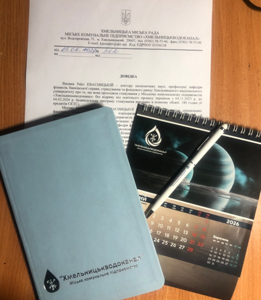 Кафедра фінансів, банківської справи, страхування та фондового ринку Хмельницького національного університету продовжує активну роботу над підвищенням кваліфікації своїх викладачів. Так, у період з 04 листопада 2025 року по 04 лютого 2026 року професорка кафедри, доктор економічних наук, Раїса КВАСНИЦЬКА пройшла стажування у Міському комунальному підприємстві «Хмельницькводоканал» та отримала Довідку про проходження стажування.