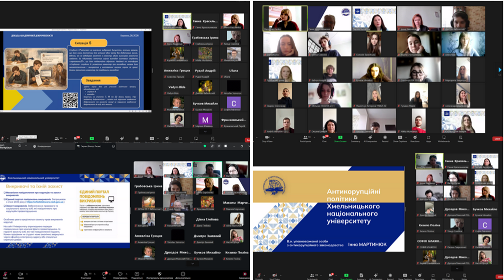 Насиченою та інтерактивною стала онлайн-програма 26 березня 2026 року, яка містила зустрічі з учасниками фокус-груп у формі вебінару «Антикорупційна політика ХНУ» за участю уповноваженої особи з питань антикорупційного законодавства Інни Мартинюк, а також розв’язання практичних кейсів «Академічна доброчесність: від правил до рішень», проведені фахівцями відділу забезпечення якості вищої освіти Оленою Гапченко та Іриною Квасницею. Окрему увагу було присвячено опитуванню «Антикорупційні політики та правила етики: що необхідно знати студенту», результати якого стануть основою для подальшого вдосконалення внутрішніх політик університету.