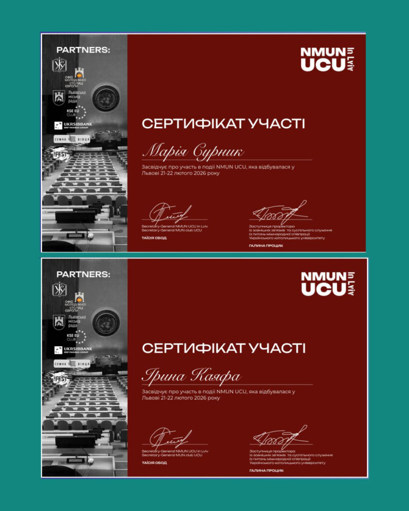 Студентки факультету економіки і управління Хмельницького національного університету Марія Сурник та Ірина Каяфа вперше взяли участь у Всеукраїнській освітній грі «Національна модель ООН» (NMUN Lviv), яка протягом 21-22 лютого об’єднала 150 делегатів з 17 університетів України.