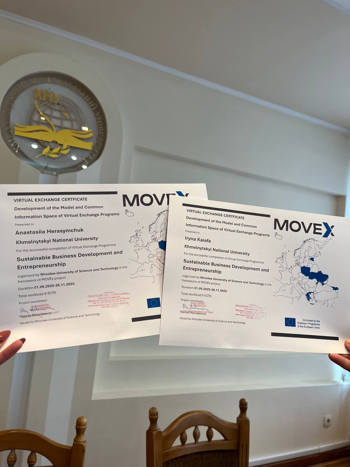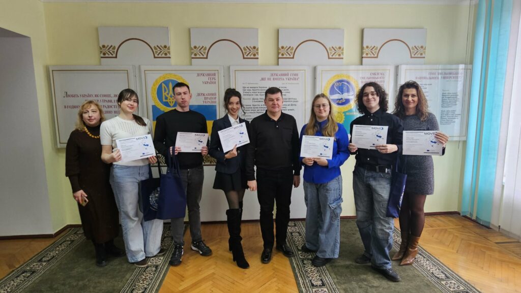 22 грудня 2025 року відбулось урочисте вручення сертифікатів 20-м студентам Хмельницького національного університету, серед яких були дві студентки першого (бакалаврського) рівня вищої освіти, спеціальності 072 «Фінанси, банківська справа, страхування та фондовий ринок» – Герасимчук Анастасія та Каяфа Ірина, які успішно пройшли програму віртуальних академічних обмінів в рамках міжнародного проєкту Erasmus+ MOVEx.