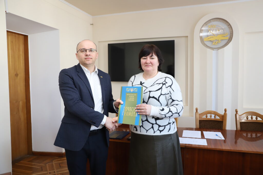 Вітаємо шановну колегу з отриманням високої нагороди — Почесної грамоти Міністерства освіти і науки України! Це заслужене визнання багаторічної сумлінної праці, вагомого внеску у розвиток освіти, високого професіоналізму, педагогічної майстерності та відданості справі. Бажаємо міцного здоров’я, невичерпної енергії, нових творчих успіхів та мирного неба!
