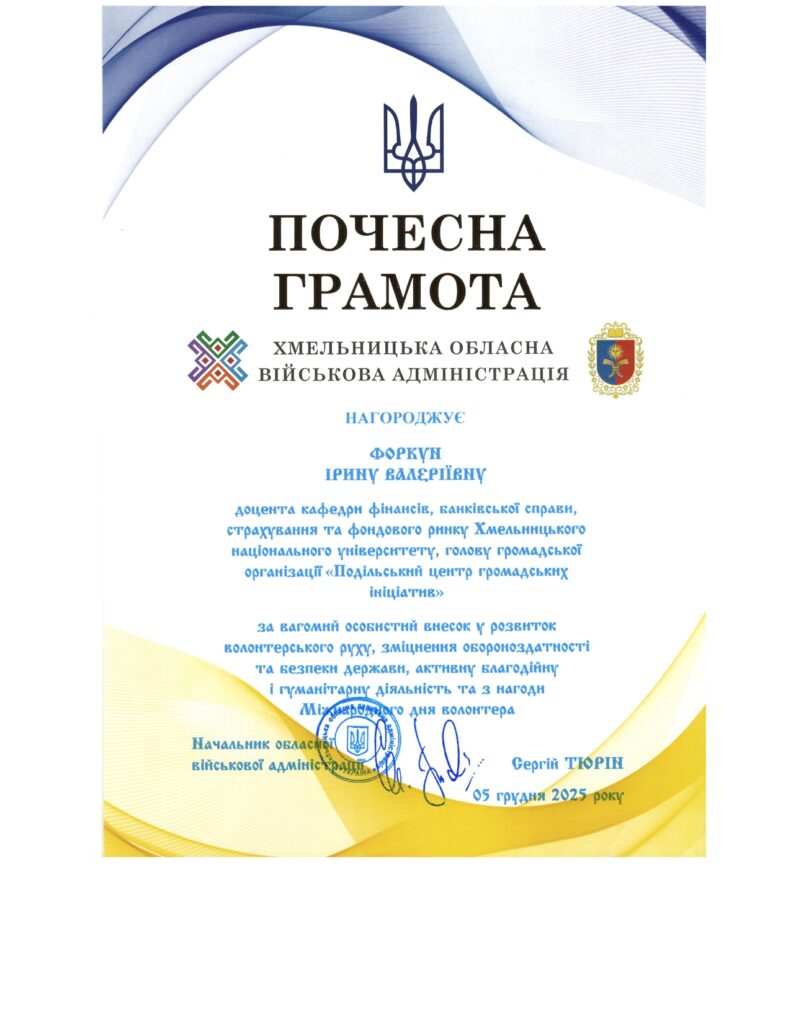 Почесною грамотою Хмельницької обласної військової адміністрації відзначено Форкун Ірину Валеріївну, кандидата технічних наук, доцентку кафедри фінансів, банківської справи, страхування та фондового ринку, голову громадської організації «Подільський центр громадських ініціатив».